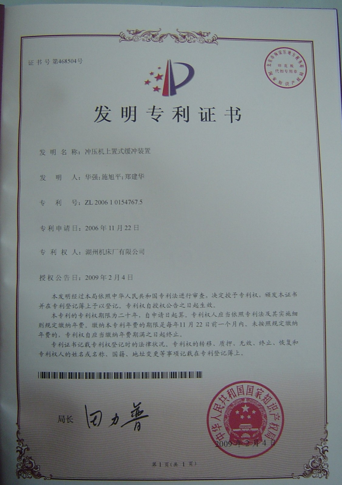探索更多我公司申請的“沖壓機上置式緩沖裝置”,經國家知識產權局依據中華人民共和國專利法審核,已于2009年2月4日獲國家發(fā)明專利授權。